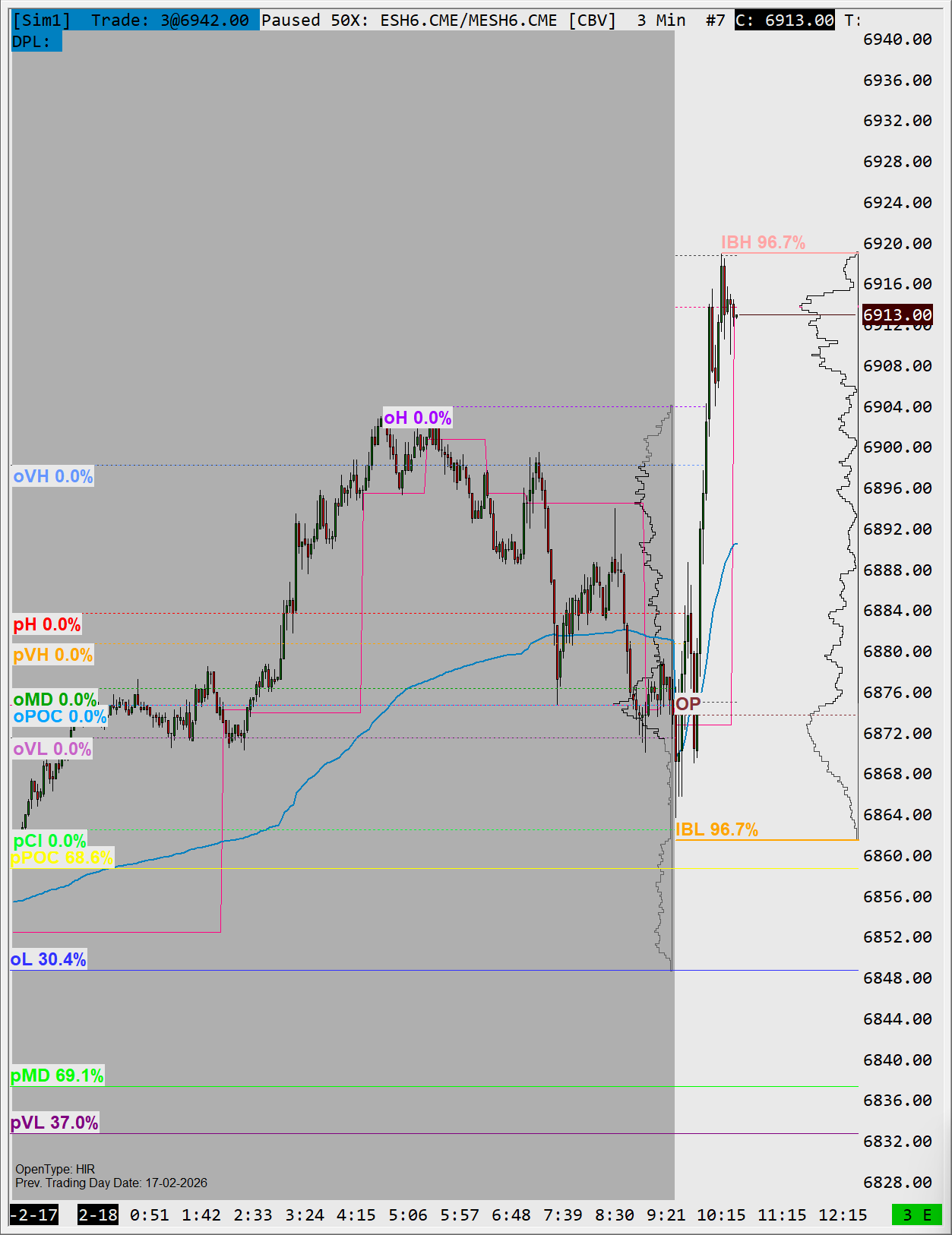 ES Futures (3 Min) — IBH at 6920 and IBL at 6862, both tested with 96.7% historical rate. HIR open type session, February 18, 2026. Statistics displayed by StatLevels Suite.