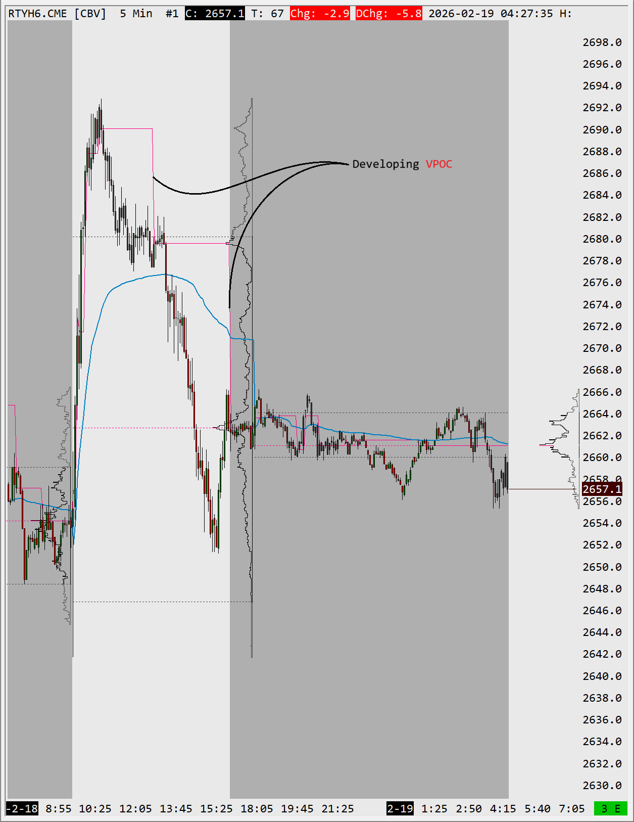 The developing session's VPOC shifts as new volume prints. If the developing VPOC migrates toward the prior VPOC, that's a convergence signal. If it moves away, the market is establishing a new fair value.